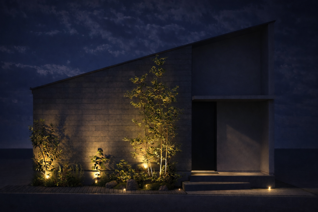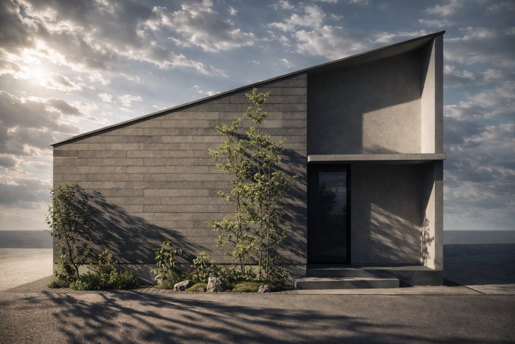 グレーの質感ある外壁と、静かに佇む黒の玄関扉。